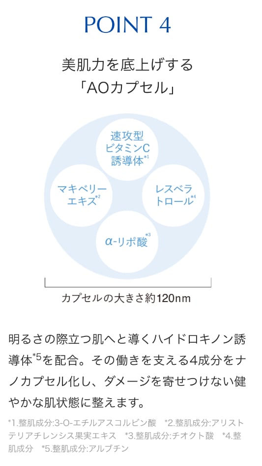 水、イソノナン酸イソノニル、DPG、シクロペンタシロキサン、スクワラン、イソステアリン酸PEG-15グリセリル、ステアリン酸、ステアリン酸グリセリル(SE)、ステアリン酸PEG-5グリセリル、PEG/PPG-25/30コポリマー、(C13,14)イソパラフィン、カルボマー、カプリリルグリコール、PEG-12ジメチコン、酢酸トコフェロール、グリチルリチン酸2K、PCAオクチルドデシル、BG、アルギニン、マンニトール(小麦由来)、グリセリン、グルコシルルチン、アルブチン、グルコン酸Na、ムラサキ根エキス、ゲンチアナ根エキス、水添レシチン、加水分解コラーゲン、ワサビノキ種子エキス、コトジツノマタ/ミツイシコンブ/ヒトエグサ葉状体エキス、ワルテリアインディカ葉エキス、フェルラ酸、デキストリン、プラセンタエキス、クズ根エキス、ダイズステロール、アロエベラ葉エキス、クロレラエキス、3-0-エチルアスコルビン酸、チオクト酸、アリストテリアチレンシス果実エキス、ブドウ葉/種子/皮エキス、レスベラトロール、テトラヒドロキシプロピルエチレンジアミン、バチルアルコール、ベヘニルアルコール、ポリアクリルアミド、ラウレスープ、クエン酸、クエン酸Na、エチドロン酸4Na、フェノキシエタノール、プロピルパラベン、メチルパラベン、赤504、香料