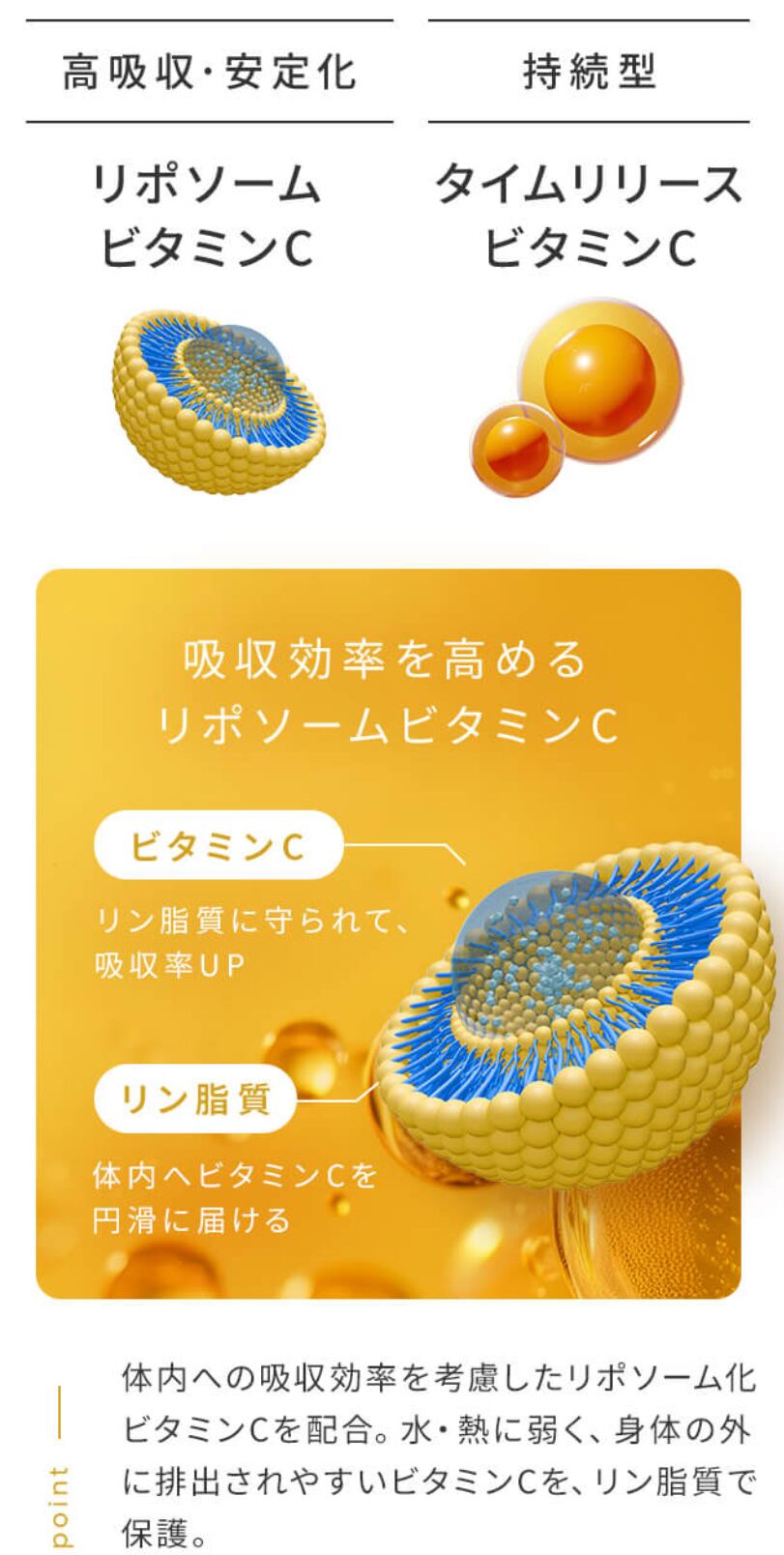 リポソーム化ビタミンC、タイムリリースビタミンCなどを独自の処方設計で配合することで、高い吸収率と吸収持続性を両立しました。