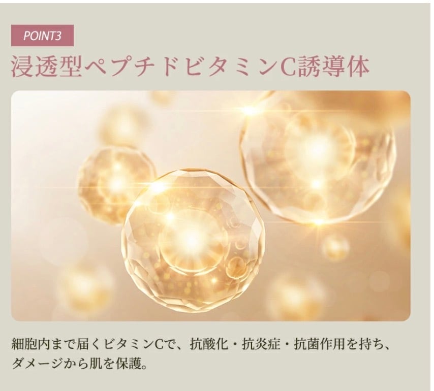 水、イソペンチルジオール、ポリグリセリン-3、ヒドロキシエチルウレア、ヒト幹細胞順化培養液、カニナバラ果実油、ホホバ種子油、ダマスクバラ花油、シストセイラタマリシホリアエキス、ゴレンシ葉エキス、トルメンチラ根エキス、アスコルビルメチルカルボニルペンタペプチド-72-トリ-t-ブチルトリプトファナミド、ヘキシル3−グリセリルアスコルビン酸、パルミトイルオクタペプチド−27アミド、パルミトイルジペプチド−18、パルミトイル合成ヒトトリペプチド−5ノルイソロイシル合成ヒトノナペプチド−1、イヌリン、ペンチレングリコール、ラウリン酸ポリグリセリル-10、カプリリルグリコール、クエン酸Na、グリセリン、BG、クエン酸、(乳酸/グリコール酸)コポリマー、ポリビニルアルコール、ラウレス-4、トリ(カプリル酸/カプリン酸)グリセリル、水添レシチン、ステアリン酸、ポリソルベート80、フェノキシエタノール、1,2-ヘキサンジオール、酢酸トコフェロール 《製造販売元》 ザ・グラツィア・インターナショナル株式会社