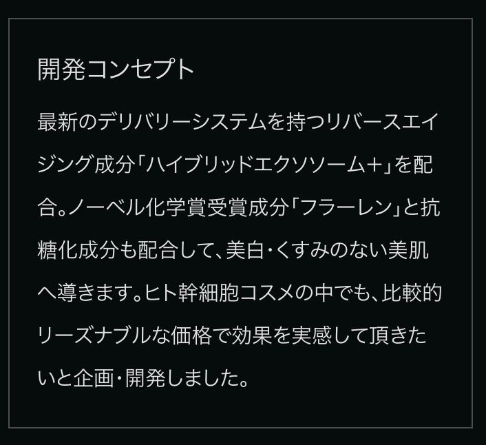 水、BG、ペンチレングリコール、ヒドロキシエチルウレア、PCAイソステアリン酸PEG-40水添ヒマシ油、フェノキシエタノール、キサンタンガム、1,2-ヘキサンジオール、クエン酸Na、EDTA-2Na、イノシトール、ヒト幹細胞順化培養液、センチフォリアバラ花エキス、ヒアルロン酸Na、PG、トリ(カプリル酸/カプリン酸)グリセリル、グリセリン、エブリコエキス、水添レシチン、クエン酸、ラネラ/ダイズタンパク発酵物、ポリソルベート80、3-O-エチルアスコルビン酸、カンフル、シロキクラゲ多糖体、セクロピアオブツシホリア樹皮エキス、ハッカ葉油、カプリリルグリコール、イタリアイトスギ葉/実/茎油、ラバンデュラハイブリダ油、レモン果皮油、(アクリル酸グリセリル/アクリル酸)コポリマー、PVP、ヒアルロン酸アスコルビルプロピル、酢酸トコフェロール、PEG-40水添ヒマシ油、ラブダナム油、ポリソルベート20、カプリロイルジペプチド-17、ラウリルヒドロキシスルタイン、規定化細胞培地9、パルミトイルジペプチド−18、ジ酢酸ジペプチドジアミノブチロイルベンジルアミド、パルミトイルジペプチド-5ジアミノヒドロキシ酪酸、パルミトイルジペプチド-5ジアミノブチロイルヒドロキシトレオニン、リン酸Na、レシチン、ヒト脂肪由来間葉系細胞エクソソーム、パルミトイルトリペプチド-5、セタノール、パルミトイルトリペプチド-1、パルミトイルヘキサペプチド-12、フラーレン、ミリスチルアルコール、アスコルビン酸、合成ヒト遺伝子組換オリゴペプチド−1、合成ヒト遺伝子組換オリゴペプチド−2、合成ヒト遺伝子組換ポリペプチド−10、合成ヒト遺伝子組換ポリペプチド−11、合成ヒト遺伝子組換ポリペプチド−9、合成ヒト遺伝子組換ポリペプチド−60、セイヨウオオバコ種子エキス
