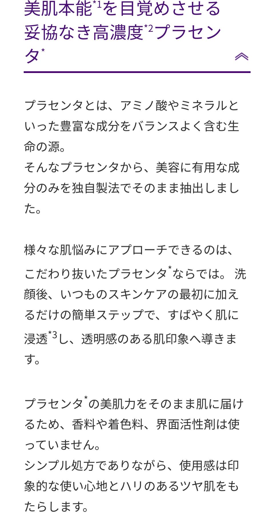 その他の成分:精製水、1,3-ブチレングリコール、トリ(カプリル・カプリン酸)グリセリル、濃グリセリン、オリブ油、ベヘニルアルコール、ジペンタエリトリット脂肪酸エステル(1)、スターフルーツ葉エキス、レモングラス抽出液、メリッサエキス、油溶性甘草エキス(2)、カンゾウ葉エキス、プラセンタエキス(1)、ヒアルロン酸ナトリウム(2)、ブリエラスチン、サクシニルアテロコラーゲン液、メマツヨイグサ抽出液、プルーン酵素分解物、キウイエキス、ヒメフウロエキス、メチルポリシロキサン、グリセリンモノ2-エチルヘキシルエーテル、グリセリン脂肪酸エステル、キサンタンガム、モノステアリン酸ソルビタン、ショ糖脂肪酸エステル、カルボキシビニルポリマー、イソステアリン酸、ジエチレントリアミン五酢酸五ナトリウム液、水酸化カリウム、フェノキシエタノール